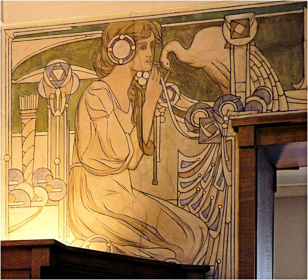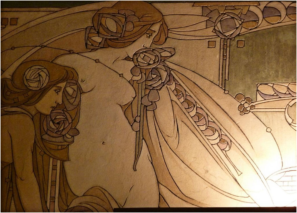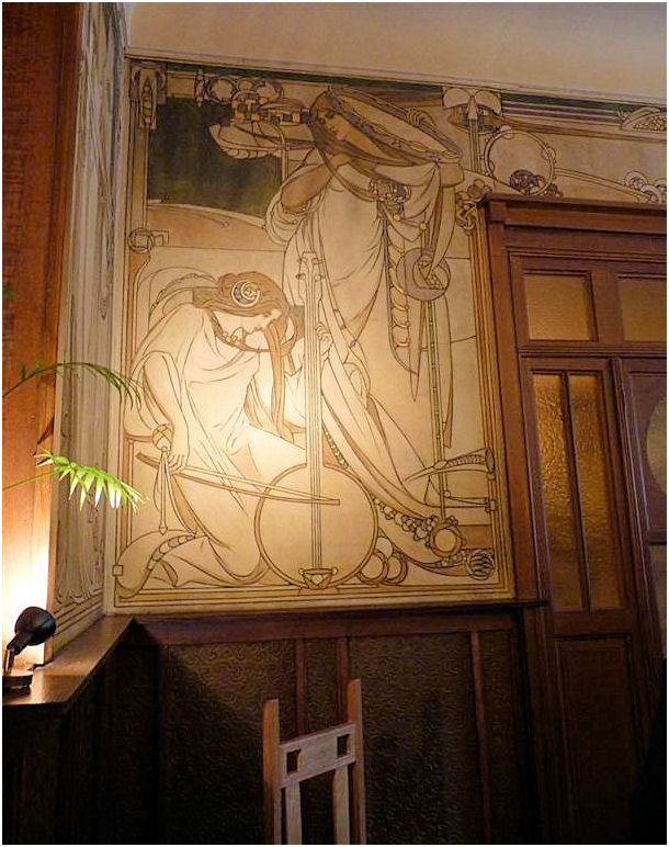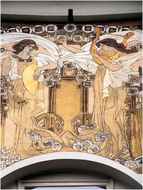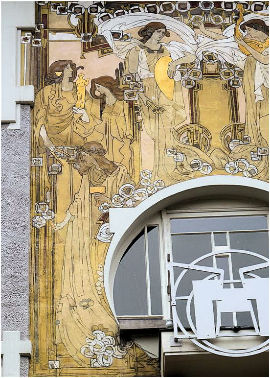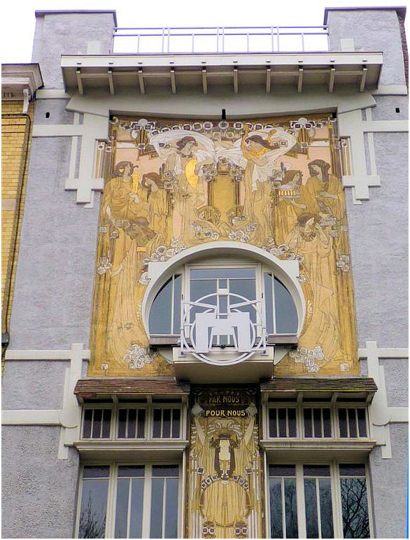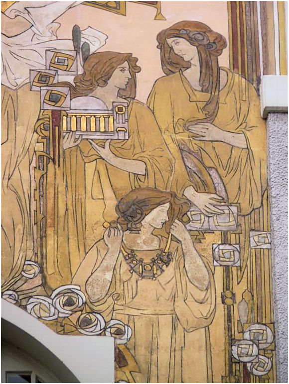 Wie in de Frankenstraat de ongebruikelijke gevelvorm van nummer 5 ontwaart tussen de meer 'normale' huizen, zal voor alles geïmponeerd zijn door de enorme sgraffiti op de gevel. Het stelt een aantal muzen voor die duidelijk zijn beïnvloed door de Prerafaëlitische vormgeving, één van de inspiratiebronnen van Gauchie, een andere was de vormentaal van Mackintosh, en dus indirect het Japonisme.