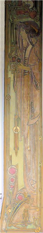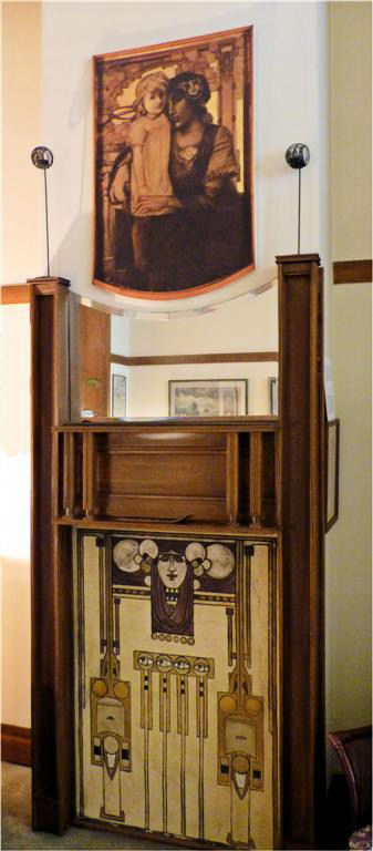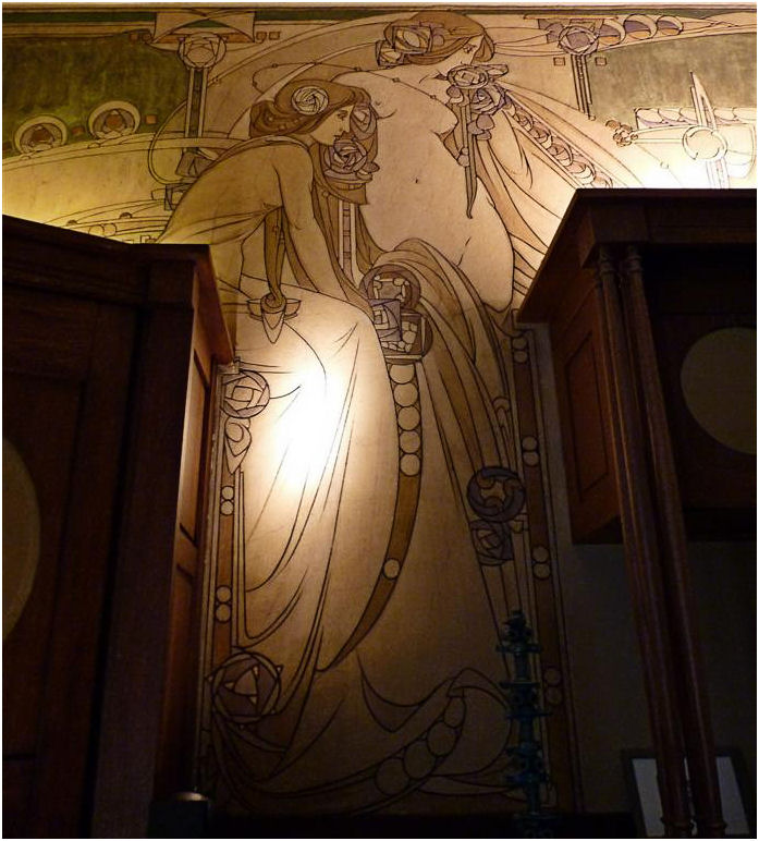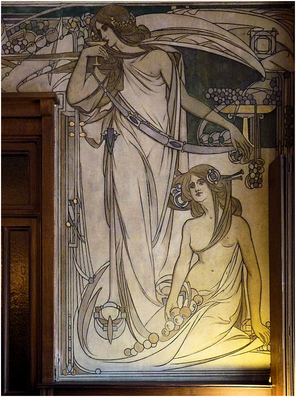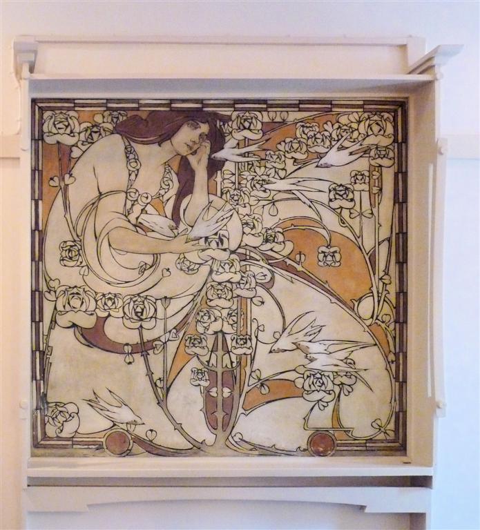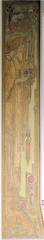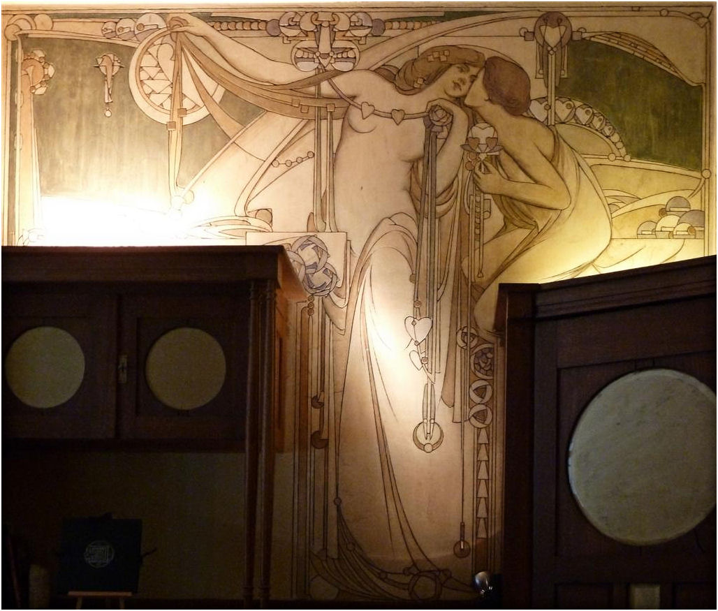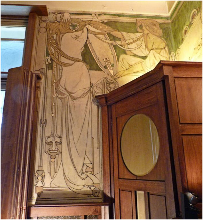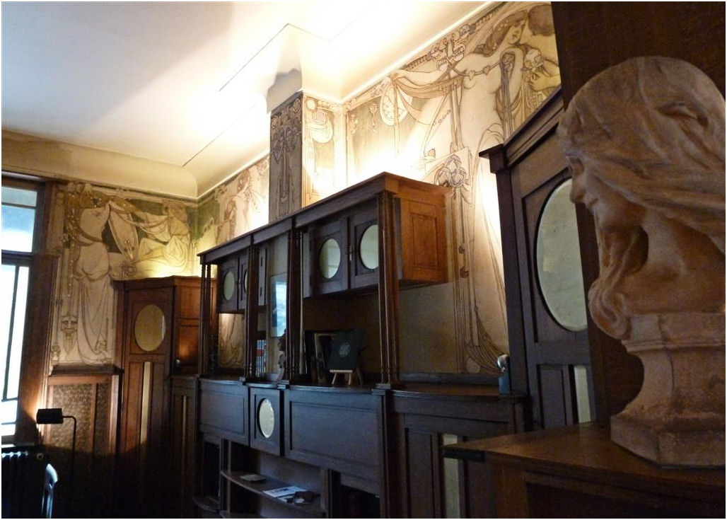 Wie in de Frankenstraat de ongebruikelijke gevelvorm van nummer 5 ontwaart tussen de meer 'normale' huizen, zal voor alles geïmponeerd zijn door de enorme sgraffiti op de gevel. Het stelt een aantal muzen voor die duidelijk zijn beïnvloed door de Prerafaëlitische vormgeving, één van de inspiratiebronnen van Gauchie, een andere was de vormentaal van Mackintosh, en dus indirect het Japonisme.