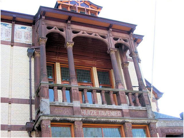 Een zeer bijzonder gebouw met een boeiende geschiedenis. Oorspronkelijk gebouwd voor een familie die een kapitaal had vergaard in de strokartonindustrie. Elke gevel heeft een ander aanzien met specifieke details. Bijvoorbeeld de dame met het stro. (van het karton)