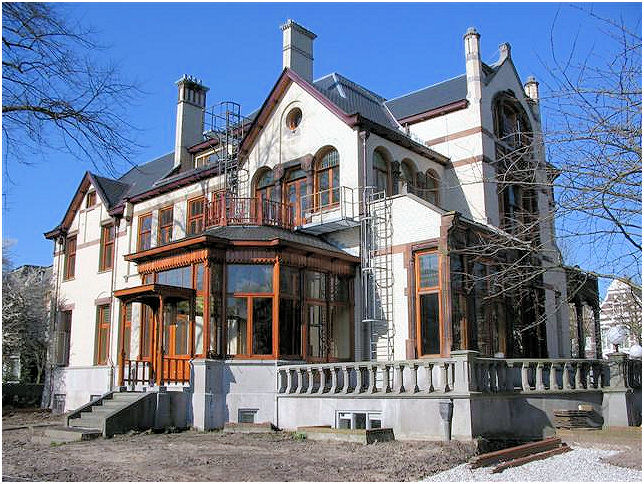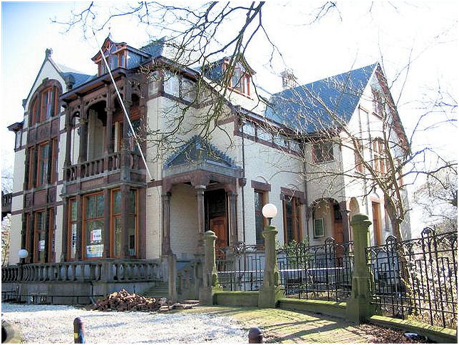 A very extraordinary building with an interesting history. Originally built for a family that gained a capital in the production of straw-board. Each front differs and has its own specific details